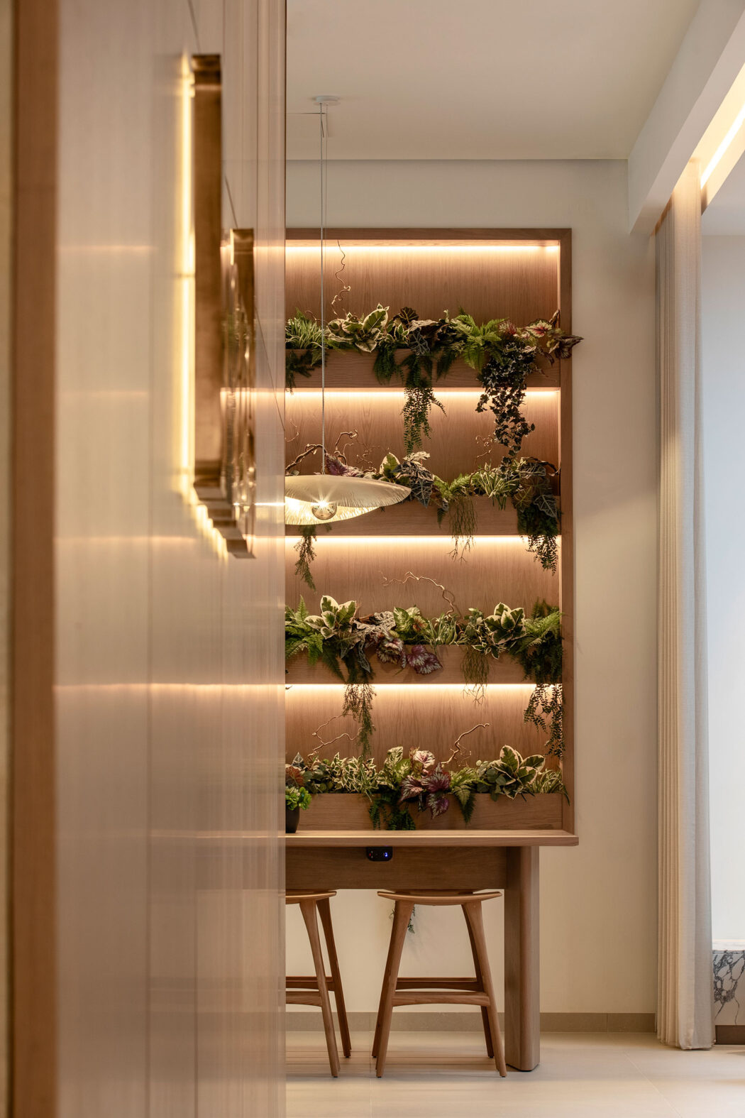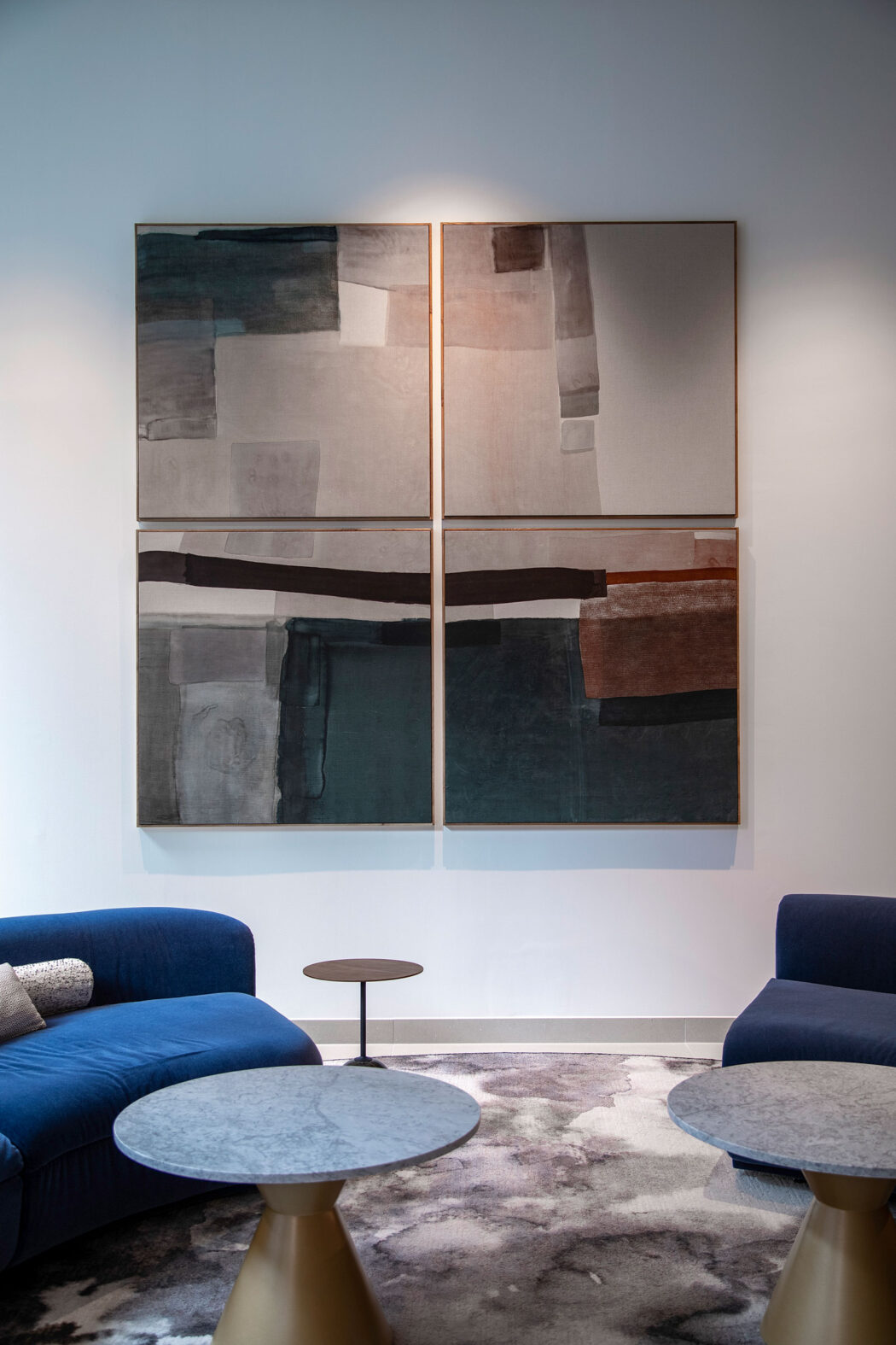 Artwork was procured from local artists and comprised of metal wire sculptures that symbolised “People Make Glasgow” and 3D plaster pieces that hint at the city’s grid layout. Large, framed fabrics are painted with natural paints and dyes, and local abstract photography lines the library area.