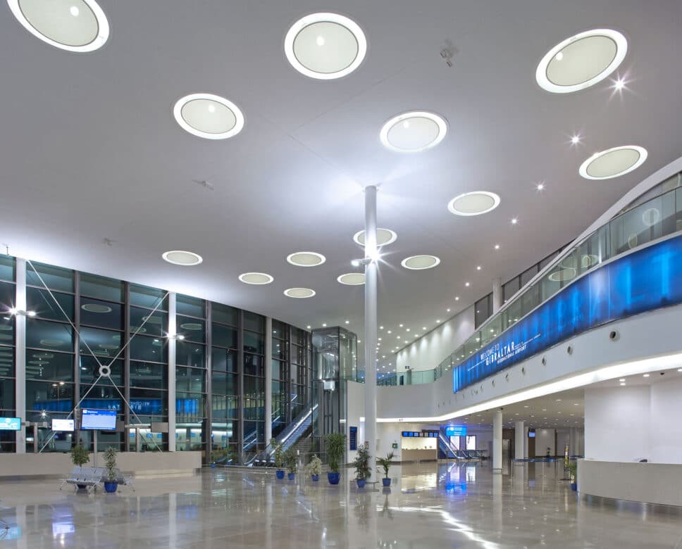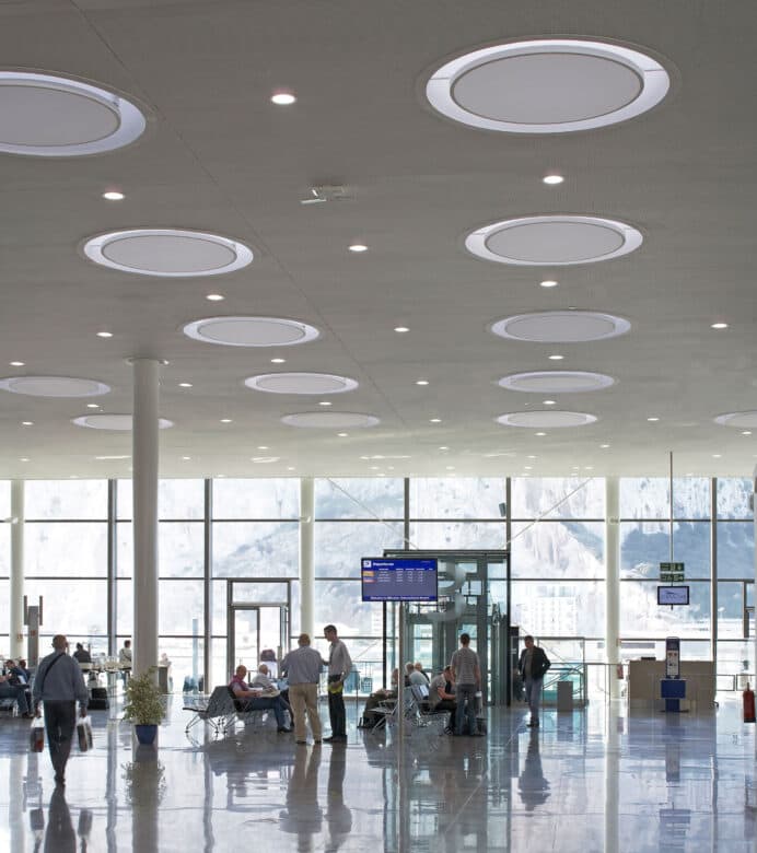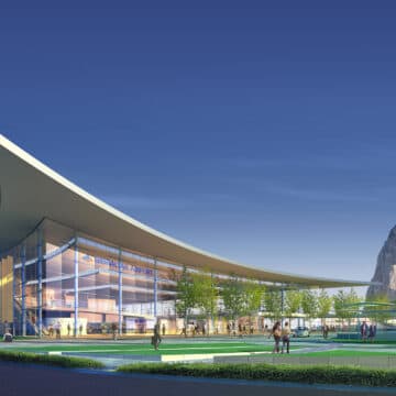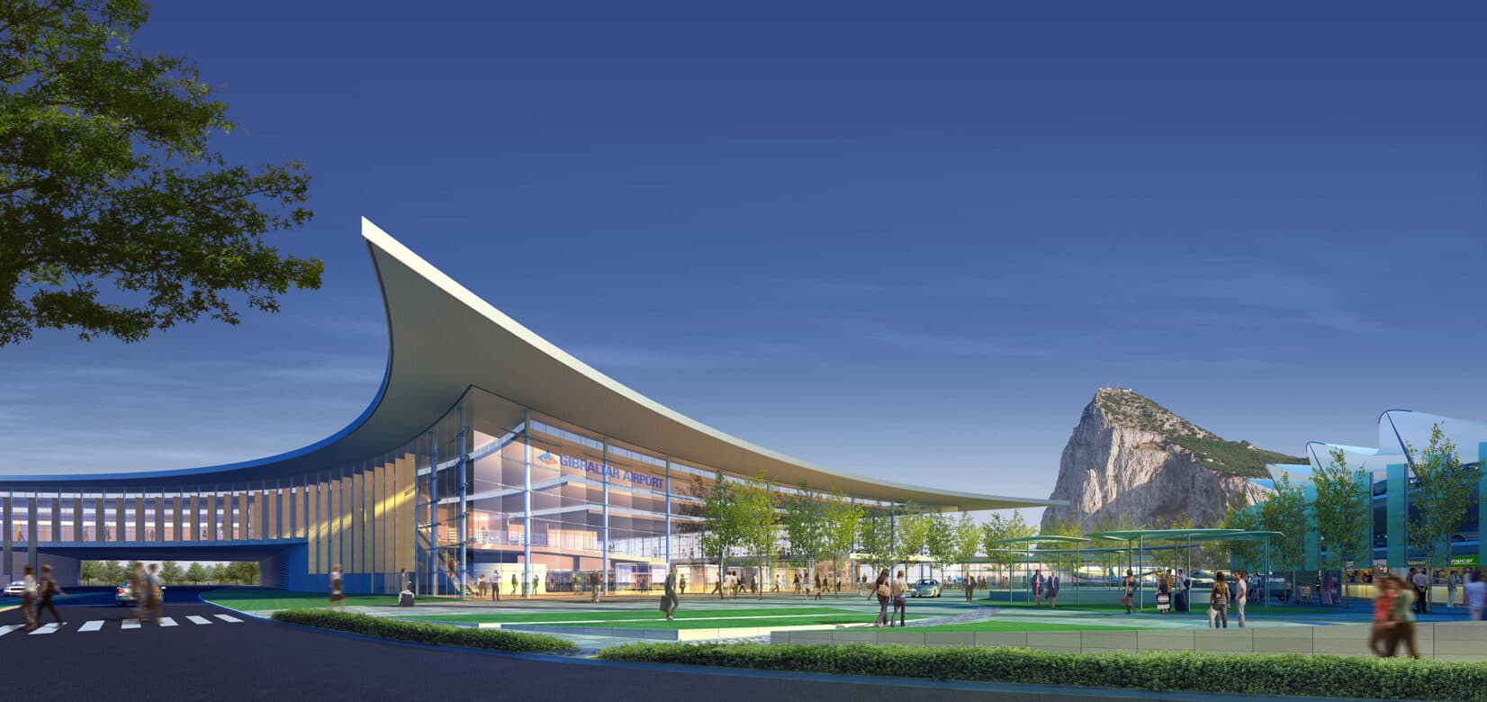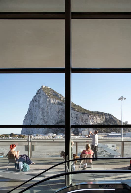 The Gibraltar Airport terminal is the first building visitors see when they enter Gibraltar by air, road or on foot. It is located immediately at the frontier and had to overcome a site with tight constraints on all sides with the frontier with Spain to the North, the existing airport runway to the South, RAF restrictions to the East and Winston Churchill Avenue to the West which intersects the airport runway.