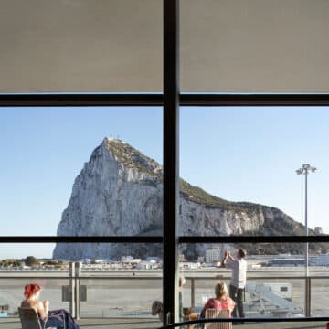 Gibraltar Airport terminal interior is organised over two floors, with a double-height concourse for check-ins and arrivals. The departures lounge occupies the first floor and extends out onto a balcony terrace that spans the building and branches out to the west with views out across the water and to the rock itself.