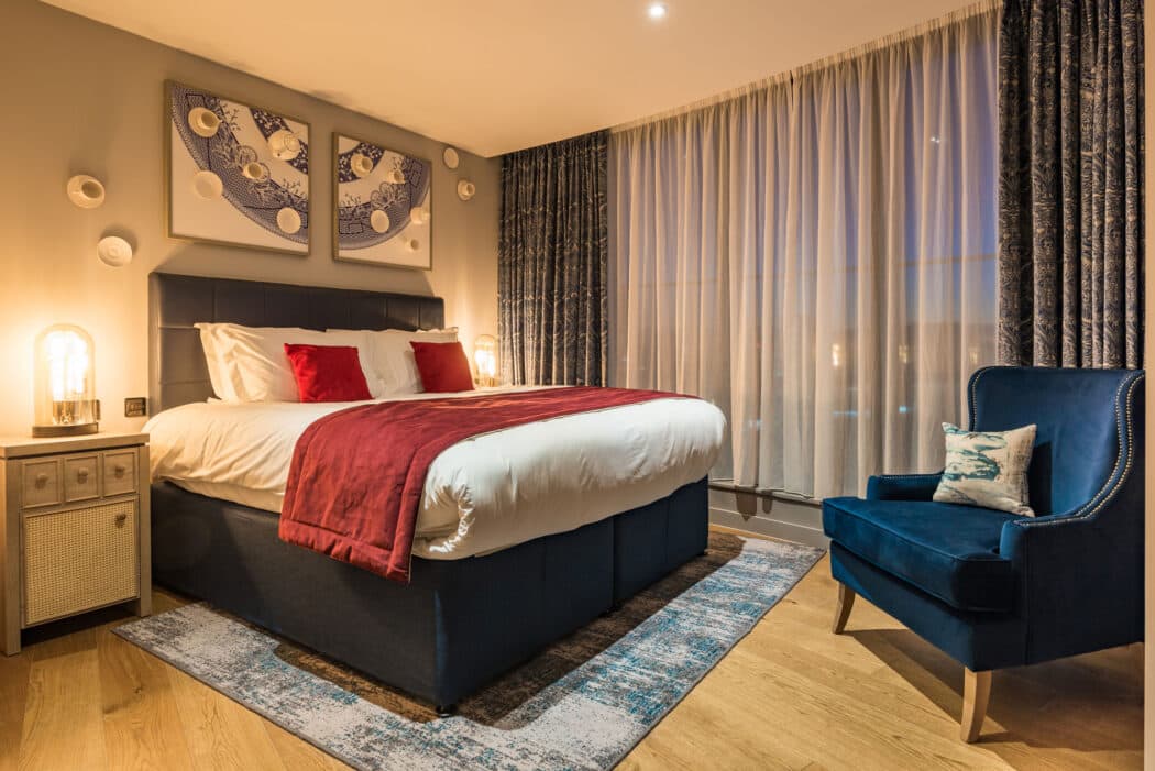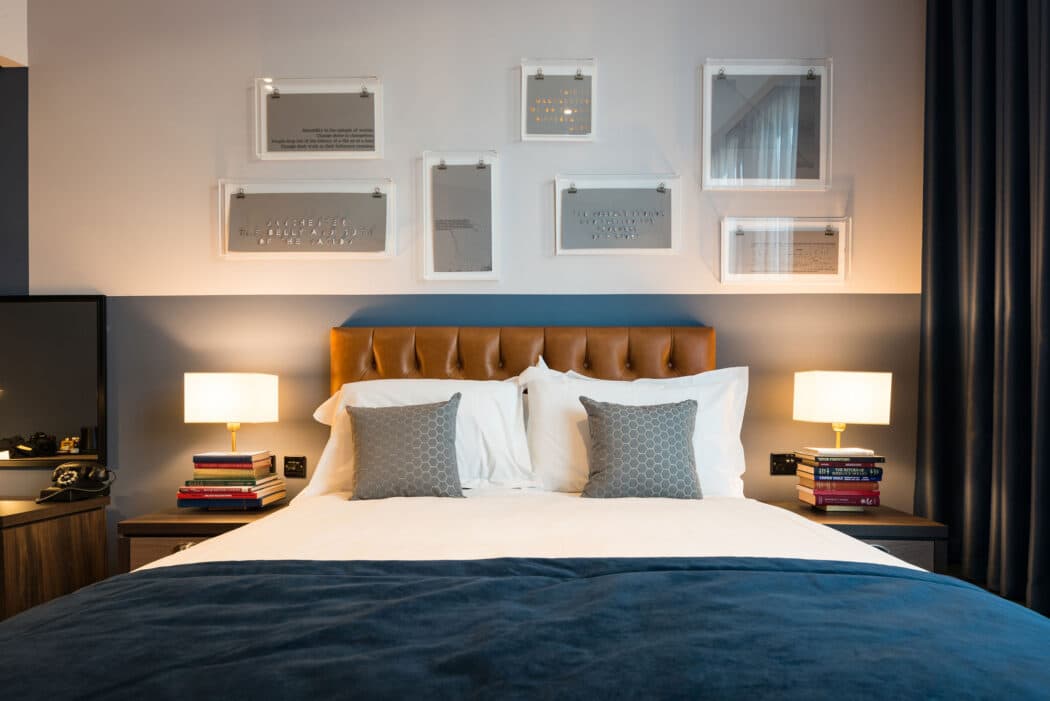 Refer back to Manchester’s literacy and printing days and one of the first newspapers, The Guardian, being printed close to the hotel site. These rooms have details such as typewriter keys for the room numbers, artwork featuring graphic text reminiscent of a printing press and bespoke lamps designed with old books and leathers reflects the materials used in traditional bookbinding methods.