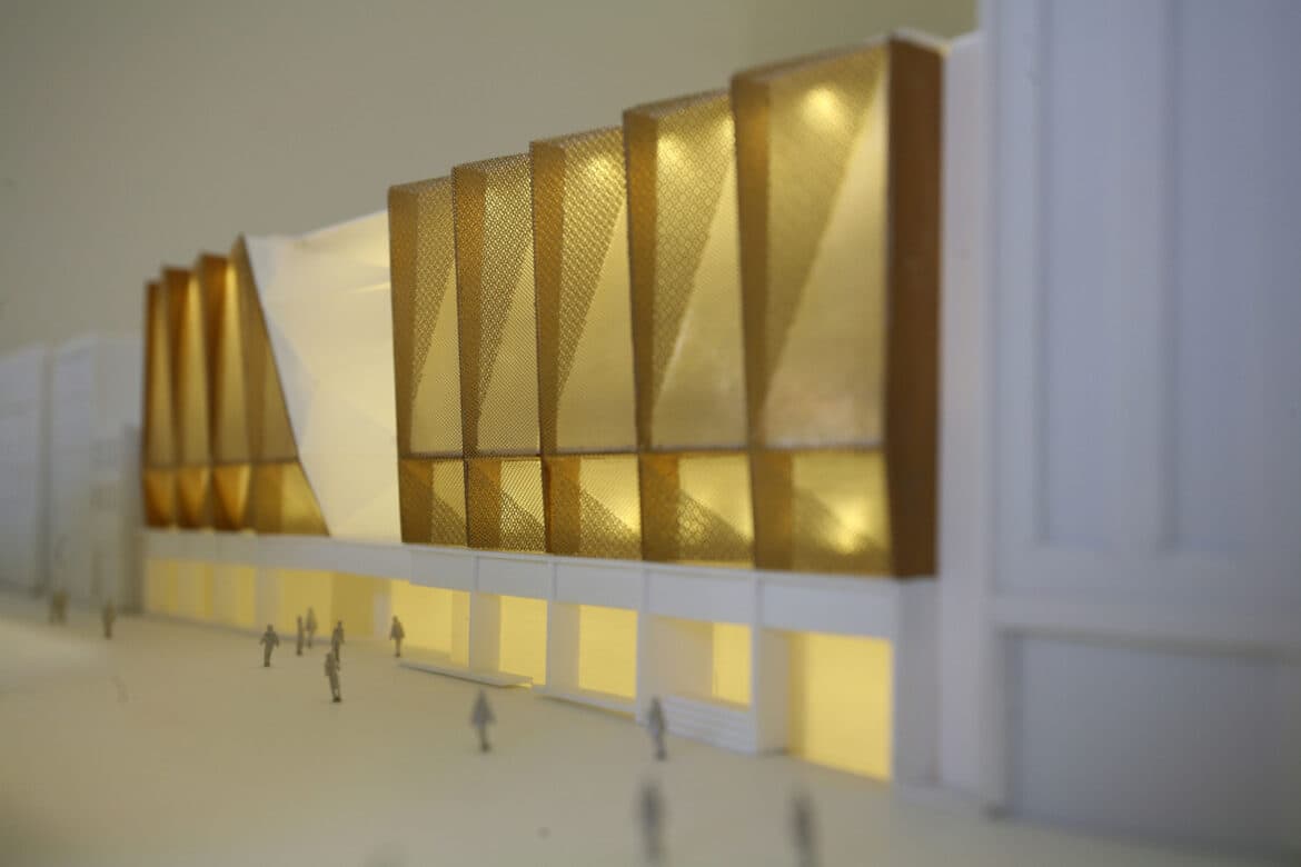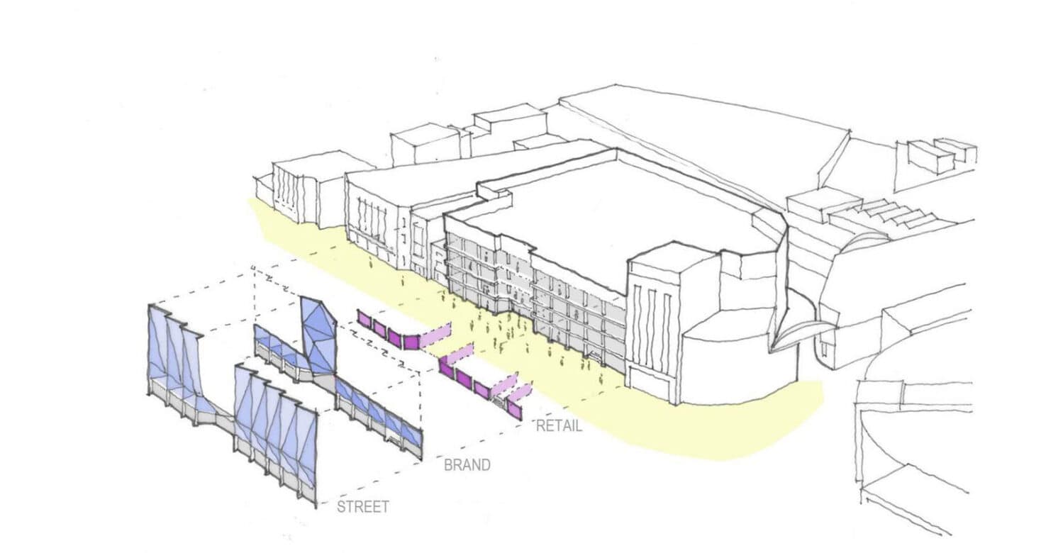 The building is over-clad with illuminated mesh facades, and while the proposal provides a distinctive and coherent identity, the High Street facade is broken down into a sequence of facets which address oblique views along the street, while the geometry of the Moor Street facade has been shaped in response to long-range vistas to the city centre. Illuminated ETFE panels above both entrances signal a direct route through the store flanked by active frontages to activate the street.