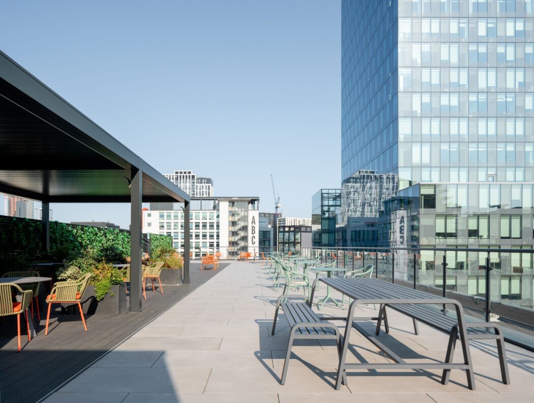 The Roof Terrace, available to all tenants, is light, airy open-air space with a pergola and comfortable loungers. Seating areas include chairs and tables for meetings and events and a dining table for eating and entertaining clients.
