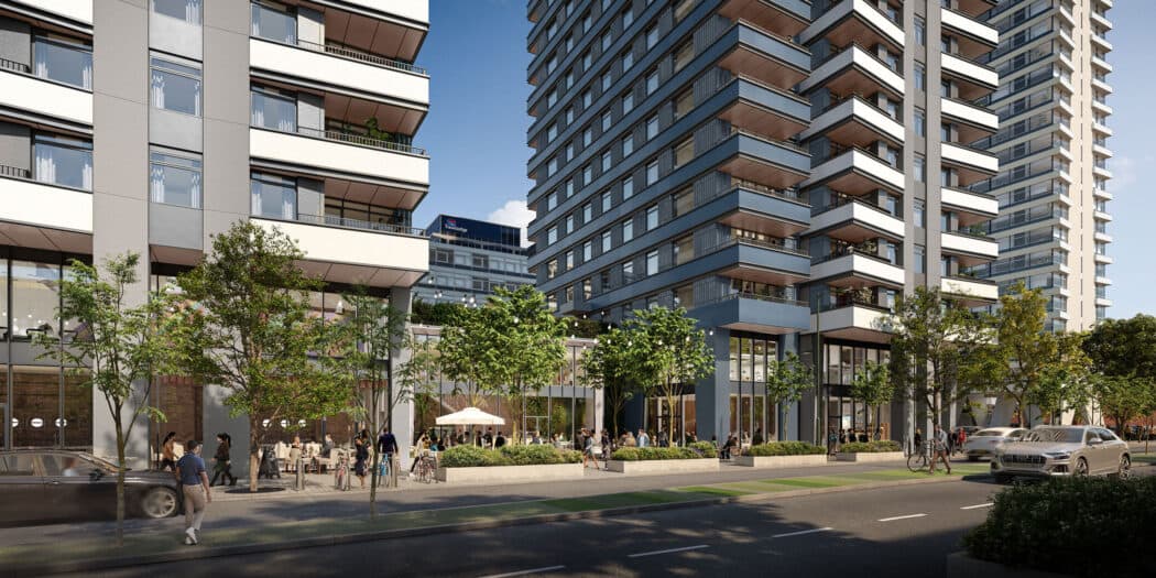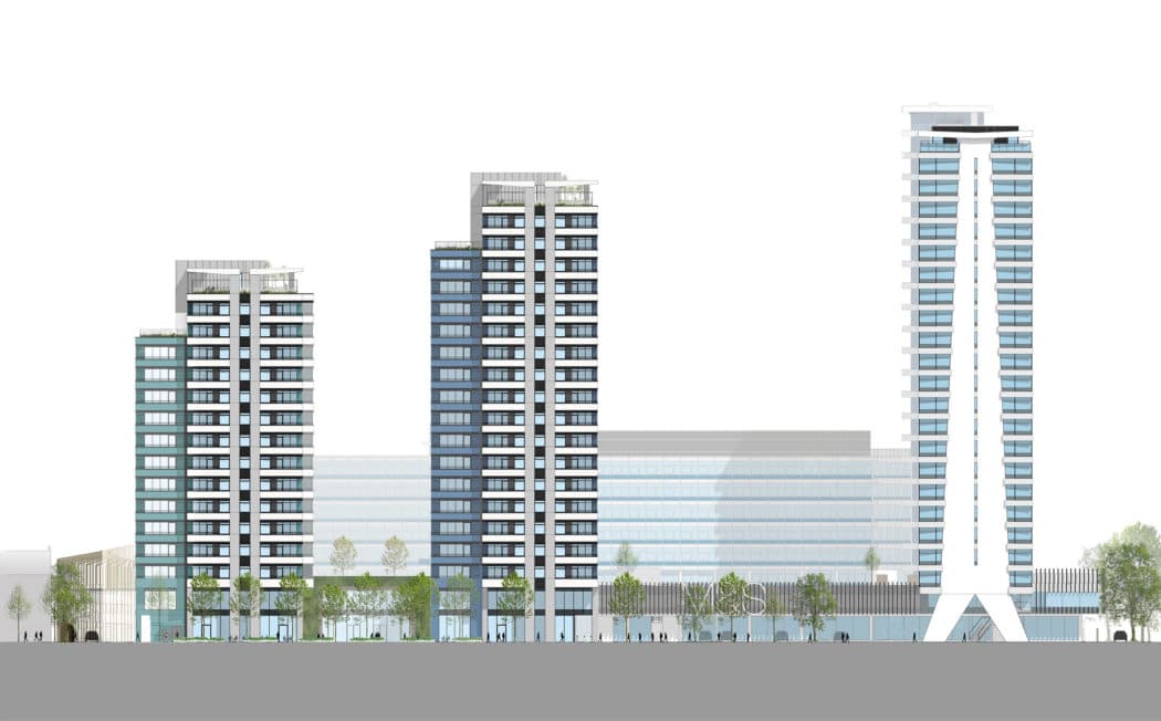The new buildings provide a modern interpretation of the design intent of the main Tower, reflecting elevational rhythm and aesthetic of the crowning, façade materiality and groundscape, whilst introducing a distinctive ceramic blue shoulder to each building that reflects design details of the original.