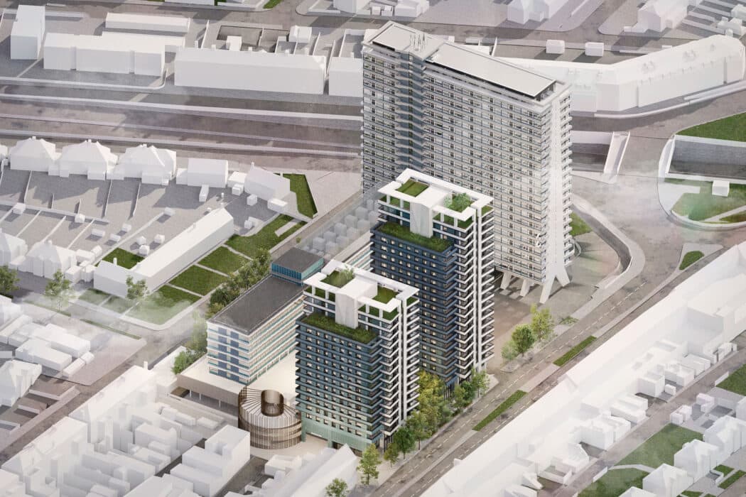 The main tower element is being converted from its original office use to predominantly residential rental use. Working sensitively with the grain of the existing building, we have planned 261 units ranging from studios to 3 Bed family units. Lower levels include residents’ amenity areas and a publicly accessible flexible co-working space. The external curtain wall cladding is being fully replaced with a sympathetic interpretation of the original design, specified to current environmental standards and providing full height windows and coloured glass panels to replicate the existing finishes. The building’s signature aluminium spandrel panels will be reinstated. The floating roof will be rebuilt and will define a set back top apartment floor.